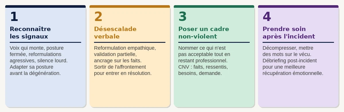 Désamorcer ne signifie pas accepter tout comportement. Savoir poser un cadre — c'est-à-dire nommer clairement ce qui n'est pas acceptable tout en restant professionnel — est une compétence clé. La Communication Non Violente (CNV) offre un cadre structuré pour exprimer ses limites sans agressivité : observer les faits, nommer ses ressentis, exprimer ses besoins, formuler une demande concrète.